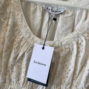 Beautiful En Saison Eyelet Mini Dress in color cream. Puff sleeve detail and a ruffle skirt make this so adorable!