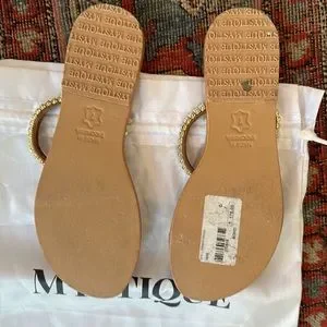 These jewel- studded sandals are really fabulous & come from the designer brand Mystique. They are made in Indonesia and have strappy faux diamond encrusted stones on them. They are a full size 7. Worn one time, they are in excellent and pristine condition. They are great for dressing up or down with lots of bling, and they come equipped with a dust bag. A great addition to your shoe wardrobe! These were sold out in stores. 🌟💥🔥