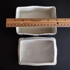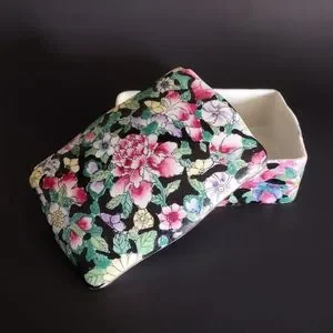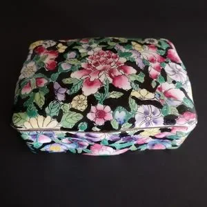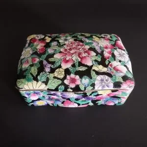 Add a touch of vintage elegance to your home or office with this handpainted Chinese porcelain trinket box. The box is beautifully crafted with a floral pattern and glazed finish, making it a perfect gift for any occasion. Measuring at 5 inches in length, 3.75 inches in width, and 2.25 inches in height, this medium-sized box is suitable for any room or space.