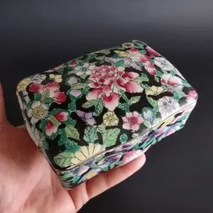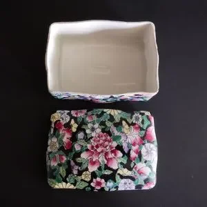 The box features a lid and is made of high-quality porcelain and ceramic, making it easy to care for with a simple wipe down using a damp cloth or warm water. This Thousand Flowers collection box is a mid-20th-century original and is suitable for anyone who loves art and romantic themes. It's handmade and painted with intricate details, making it a unique piece for any collector.
