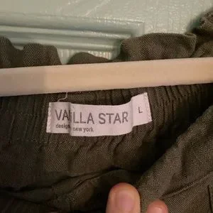 1 pant - Vanilla Star olive green pull on pant with elastic “paper bag” waist and elastic at leg hem, cotton blend/linen feel, super comfortable and roomy