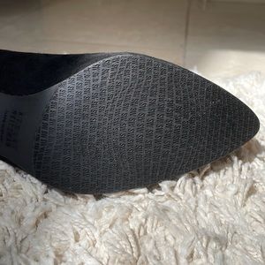 A very popular black suede bootie from Stuart Weitzman. The boot has a small platform and the best part is the elasticize fabric that runs around the ankle. Size 8 medium but this runs small and really feels like a 37.5 because I am an eight and it feels snug now. Approximately 3 inch heel. EUC, but there is a cut on one heel, but it can be easily blacked out. I think I wore them twice and managed to do that. I wanted to show it the way it is before I did anything else. You know how easy it is for suede to get marked up. Made in Italy. SW box comes with it, but I do not think it is the original box.