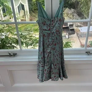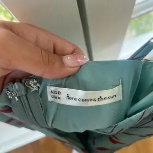 This Here Comes The Sun Dress in teal has barely been worn and is in great condition. It ties in the front and has adjustable straps. Also, the dress zippers in the back.