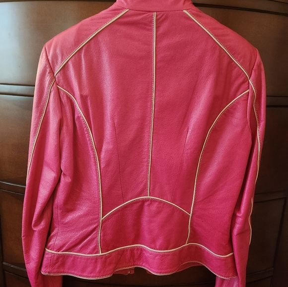 Danier leather jacket in hot pink color with white accents and white lining. It is perfect for spring or fall.