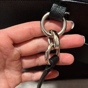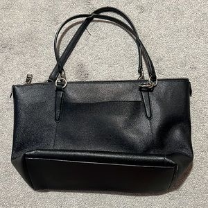 Coach black tote bag, silver accents, inside zippered pocket, additional 2 inside pockets, handles are worn (pictured), slight scuff mark on the bottom (pictured), smoke-free, pet-free home