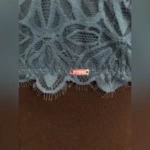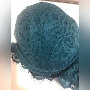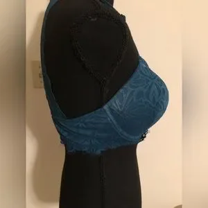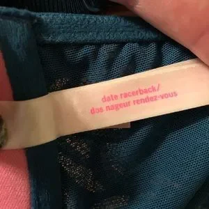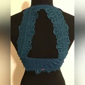 This beautiful, lacey “date racerback” VS bra is a very nicely saturated teal color. Delicate lace forms a triangle in the back. Front closure, hot PINK padding. Pre-owned in excellent condition! 34DD