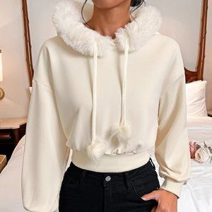 White Casual Womens Fuzzy Trim Drop Shoulder Drawstring Thermal Lined Hoodie