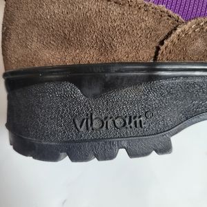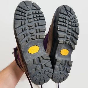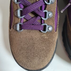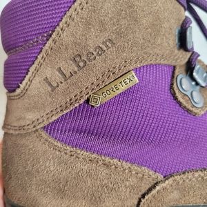 L.L. Bean Air 8000 Gortex Hiking Boots. Genuine suede boots in brown and contrasting purple trim and laces. Insulated with waterproof full-grain leather and Cordura nylon fabric. Waterproof, breathable Gore-Tex lining. Vibram rubber sole for reliable traction, especially on the downhill.