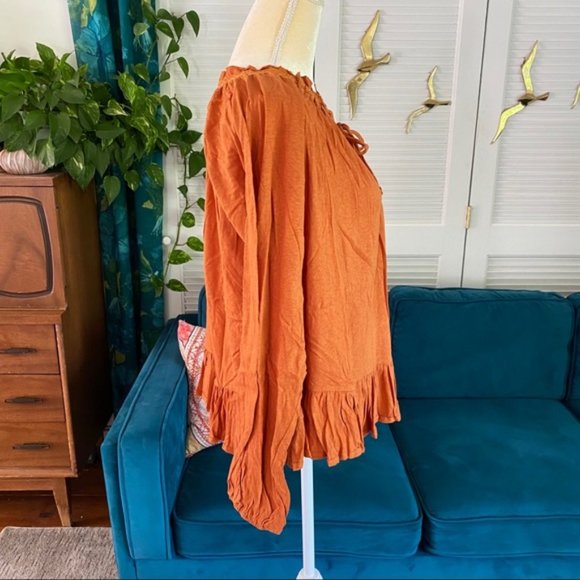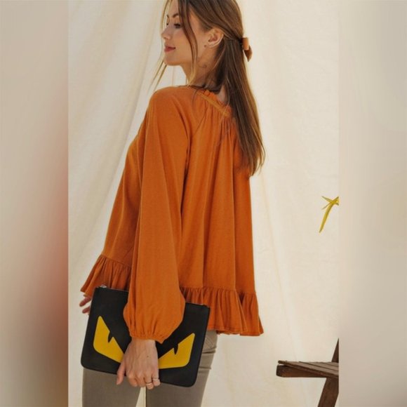 Erica Long Sleeve Cotton Slub Babydoll Tunic top in the color Pumpkin, a perfectly autumnal pumpkin orange, bohemian rust / terracotta color.
