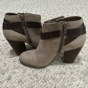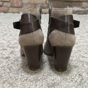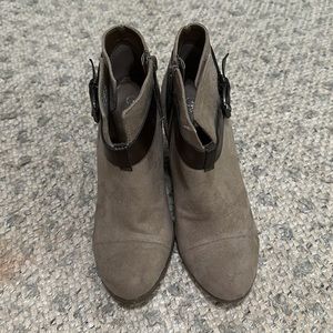 Carlos Santana faux buckle heeled booties. Zip closure.