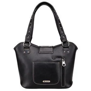 Tooled design on genuine leather on the flap and front of the bag. Silver embellishments. Zipper enclosure on the top of the bag and one on the back to conceal the handgun (9.5 x 5.5). Main compartment divided by a medium zippered pocket, also includes two open pockets. An open pocket on the back, metal feet on the bottom for protection and stability and double flat straps.