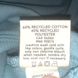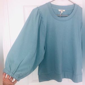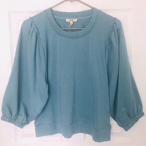Tealish blue colored Splendid puff sleeve sweater. Crew neck. Small ruffle detail on each shoulder seam. Elastic cuffs at bottoms of oversized sleeves. Made of 60% Recycled Cotton, 40% Recycled Polyester. Size small. New with tags (paper tag contains flower seeds and should be planted!)