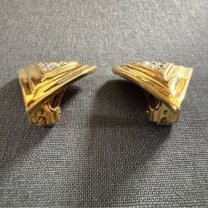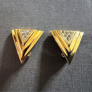 1990s Vintage Gold Tone Triangular Clip On Earrings with Clear Crystal Accents