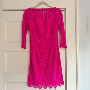 Lilly Pulitzer fuchsia lace dress with 3/4 length sleeves and a scallop hem.