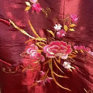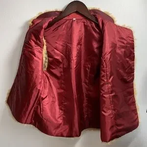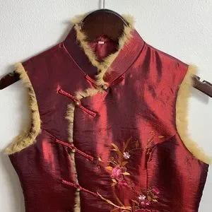 Antique Floral Embroidered Burgundy Silk Vest with Golden Fur Trim, frog toggles