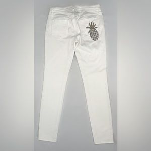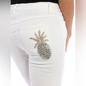 Five Pocket Stretch Denim Style; Embroidered Pineapple on Back Pocket Made of Rhinestones and Beads.