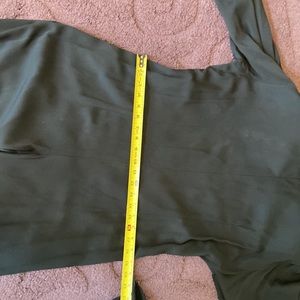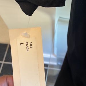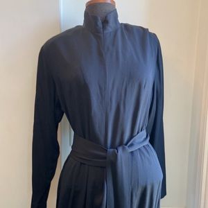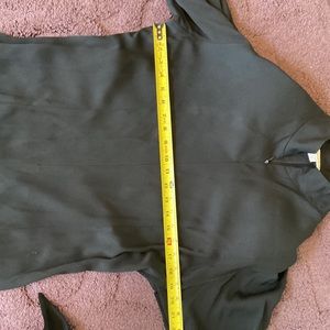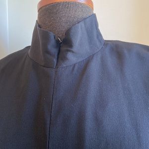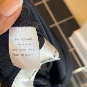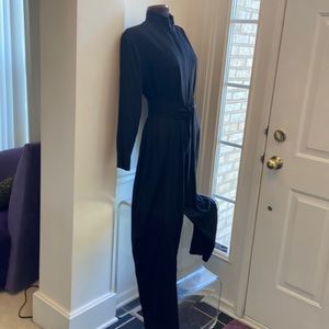 Gorgeous chic black one piece. Crew neckline. Concealed front zipper closure. 3 inch wide self tie belt. Wide leg cut. Soft padded shoulders. Excellent condition