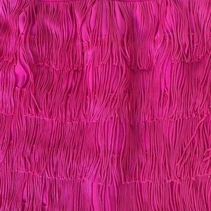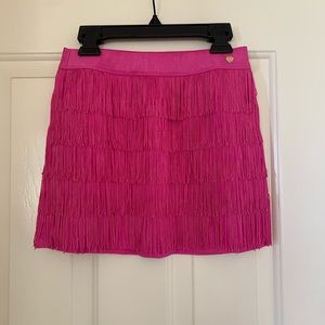 Juicy Couture girls hot pink fringe mini skirt, size 8-10. Waist is 12’ flat and length is 12.5’ long. Fringe on front and back, pull on skirt. Lined, 100%polyester. In perfect condition.