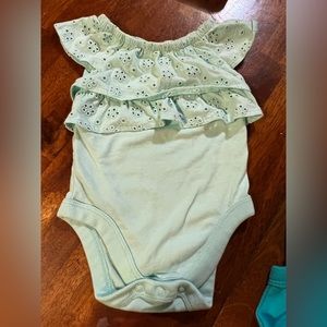 4) blue green onesie with eyelet ruffles on shoulders and top