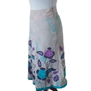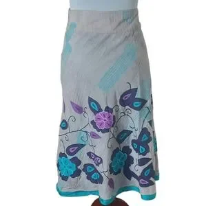 Gorgeous a-line cotton skirt with applique aqua blue and purple floral pattern and embroidery.