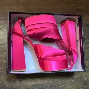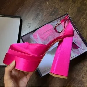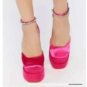 A pair of satin heels featuring a chunky heel, stacked platform sole, closed toe, adjustable ankle strap, faux gem embellishments, and high-polish hardware.