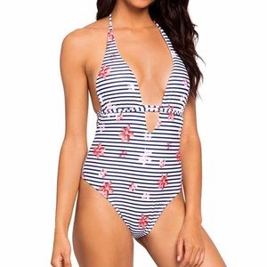 L Space Floral Bay Pamela Striped Halter Top One Piece Swimsuit Size 4