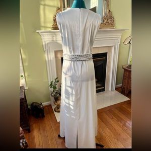 Three pieces, long satin long sleeves dress and gorgeous hand embroidered light fabric on top, hidden zipper in the back of the satin dress, comes with embroidered matching belt.