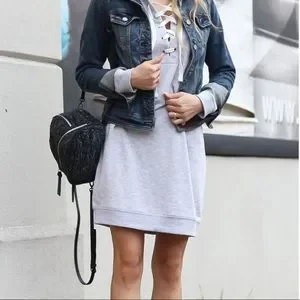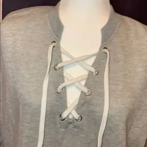 Cozy sweatshirt dress with super soft fleece lining. Cute lace up the front, step hem shape slightly longer in back. New and unworn with tags, size M by Solutions.
