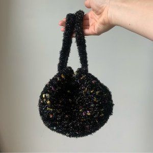 This vintage ball-like handbag is one of a kind! Round with matching chenille handles. Easily hold a cellphone and a wallet.