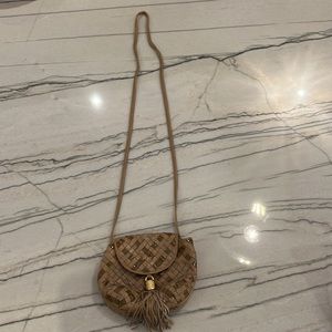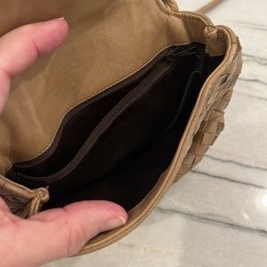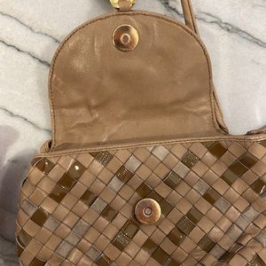 Beautiful bag that can be a shoulder bag or cross body. The leather, suede and patent weaving is very nicely done. Tassel leather is in great condition. Zip pocket inside and pouch on the back. Some natural wear on the suede noted in the photos. Snap closure works well. This was a well kept bag used for a nice night out.