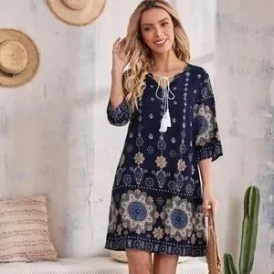 NEW Bohemian Shift Dress Mandala Print Tassel Tie 3/4 Sleeve Emery Rose Navy Lrg