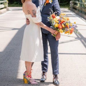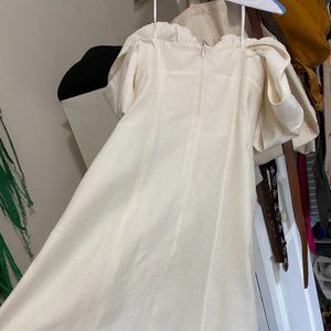 This is a worn-once Cult Gaia SS 2023 Muna Dress in off-white. It has beautiful sleeves and is off-the-shoulder and backless. I wore this for my wedding day and it has since been dry-cleaned. It is a size 4 and the only alteration is in the hem, in which was made to hit below the knee, midi length. I am 5'2".