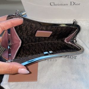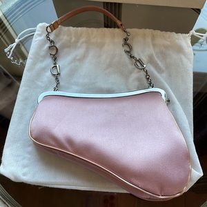 Dior pink mini saddle in silk adorned with patent leather accents and silver hardware the hardware remains bright and shiny in prestine condition clean inside and out 100% authentic comes with the mirror the original box and dust bag