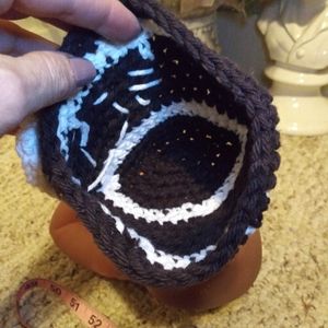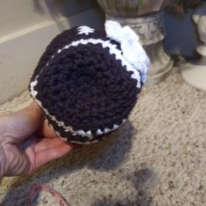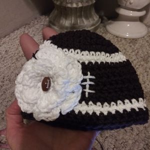 NWOT Precious dark brown and white hand crocheted football themed beanie for a baby girl. Beanie has large crocheted white flower with football shaped button in the center, and white stitching like a football. Length is 5 1/4, width is 6 inches. Circumference is 12 3/4 without stretching. Please see all photos.