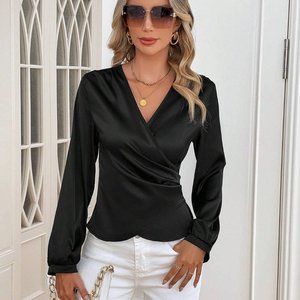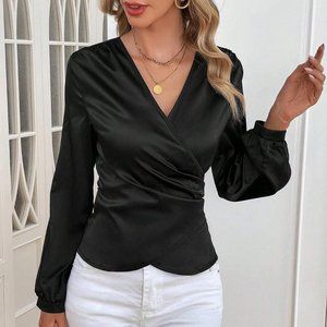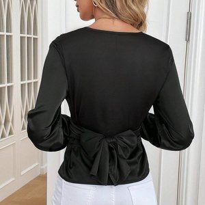 Black Preppy Womens Surplice Neck Lantern Sleeve Blouse