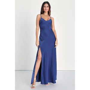 NWOT Divine Romance Navy Blue Satin Backless Maxi Dress