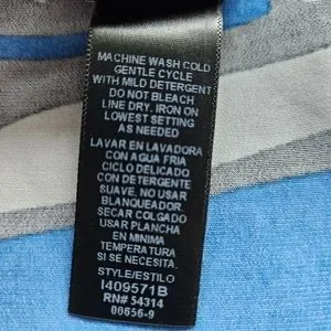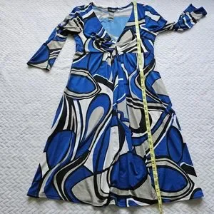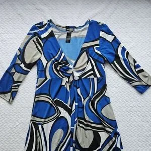 Bisou Bisou Michele Bohbot, blue, white, black & gray geometric print knee length dress. Stretchy & flowy. V-neck, empire waist, 3/4 length sleeves & pockets. Size 10.