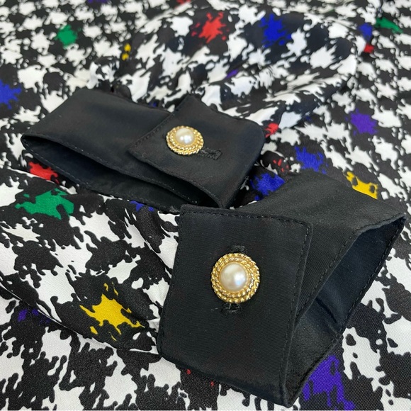 Black trim at cuffs, neckline, faux pockets and down front button closure. Houndstooth pattern is black, white, red, yellow, green, blue, and purple. Buttons are gold toned with a faux pearl center
