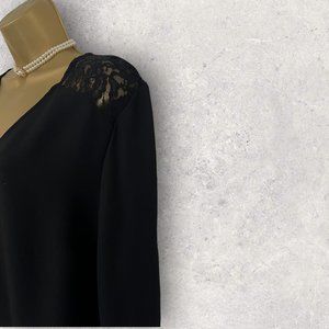 Lovely M&S black shift dress in a crepe feel fabric with gorgeous sheer split sleeves. It has gorgeous lace panels on the shoulder. Such a chic & elegant dress, suitable for any season.
