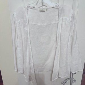 Worn once, drycleaned. Pretty white linen topper with long sashes that wrap the waist.