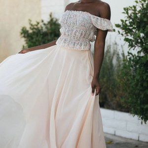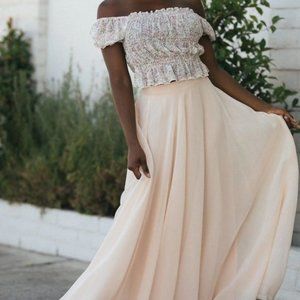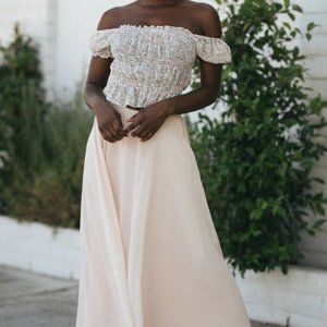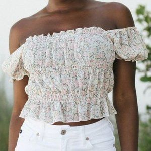 Ditsy pink floral on white/cream background. Cropped with smocking. Can be worn off the shoulder. Slight peplum bottom. NWT. Super cute!