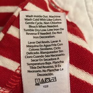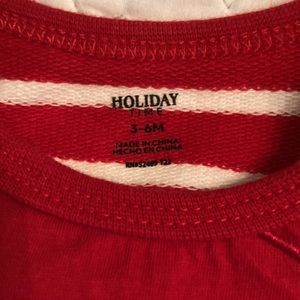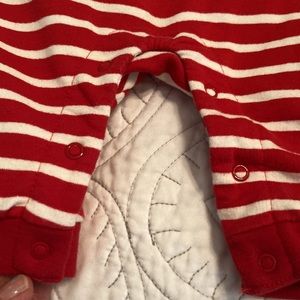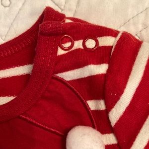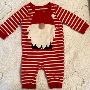 Red & white striped one piece outfit with Santa appliqué on front. Unisex size 3-6 months. Snap openings at neck and legs.