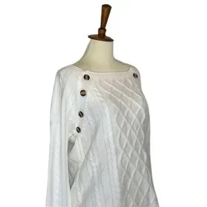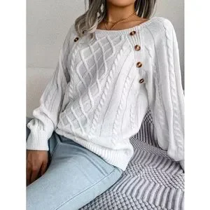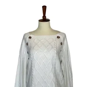 The gorgeous long sleeve sweater has a wide rounded neckline, a loose fit, soft fabric, and a beautiful knit design. Cable knit detailing is on each side and down the sleeves, with a unique diamond shaped knit criss crossing over the front of the sweater. It has a dropped shoulder, with four beautiful tortoise shell buttons that add interest.