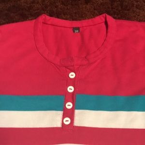 The condition is very good. It is made out of cotton. It has stripes. It is used. It has 4 little buttons. There is no collar.