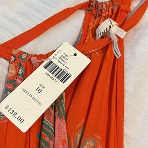 This cute little number still has the tags and has never been worn. from the top of the shoulder strap to the hem line is 39 1/2 inches. it has an elastic waist: without stretching it, it measures about 30 inches from seam to seam. It has one side pocket.
