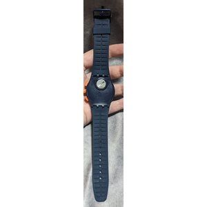 Fun and sporty navy and orange Swatch Watch. It does not come with It's original packaging but it has never been used and is in like new condition. The band is made of a super soft silicone and the buckle has Swatch engraved into it. The face is navy blue while the lettering is mostly orange with some white. The hands are also white. The back says Swiss made, water resistant, four jewels. See photos for detailed face.