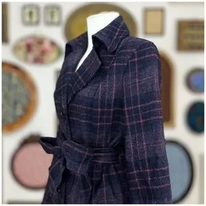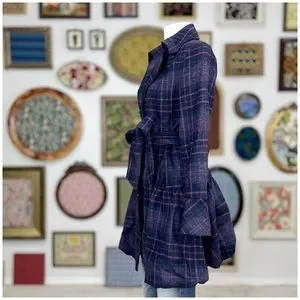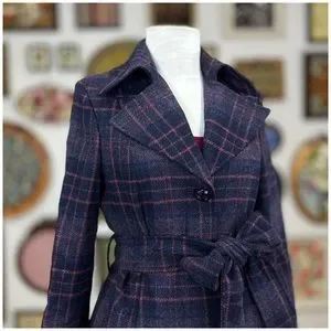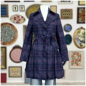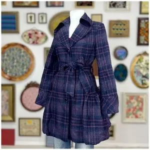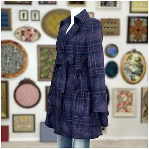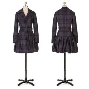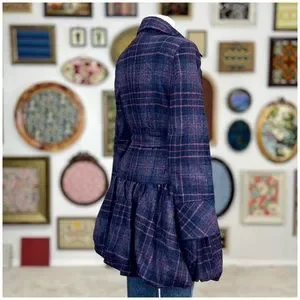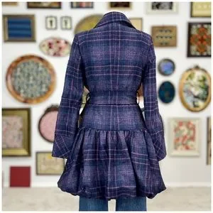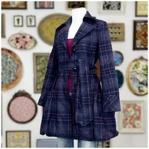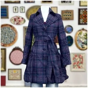 Rare and hard to find tweed coat featured in the fall 2007 Anthropologie catalog. 100% wool shell, acetate lining, made in England. Removable belt, bubble hem, side pockets, faceted gemlike buttons fasten the front. Measured laid flat, relaxed, and closed: approx 36” length shoulder to hem, 19” armpit to armpit, just under 17” at the narrowest point of the waist.