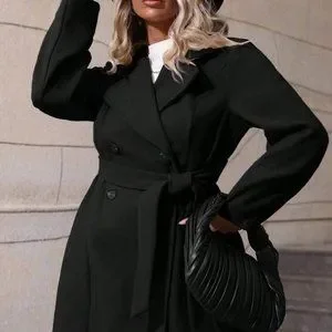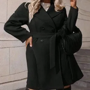 Black Preppy Womens Lapel Neck Double Breasted Belted Overcoat