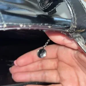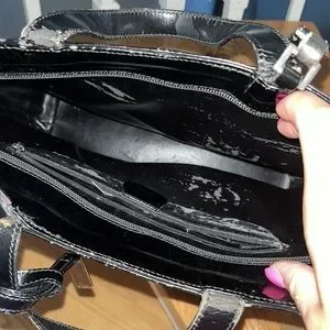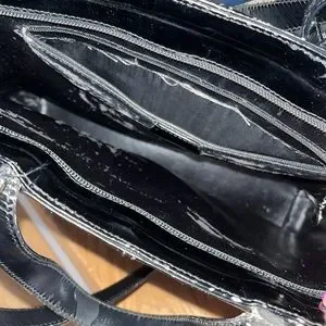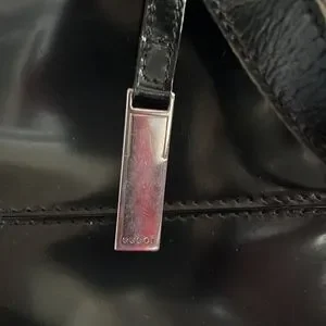 Black patent leather Gucci bag. This bag is well loved with visible scuffs on the INSIDE (see photos). The outside looks great. It comes with a long strap making it a crossbody. Perfect for a work bag, it can fit a small laptop.