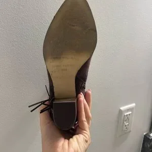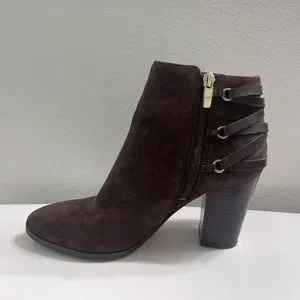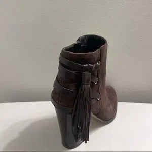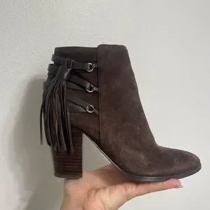 Lightly worn dark brown suede booties with fringe detail. Great for fall with midi dresses or pants! Side zipper about 3” heel.